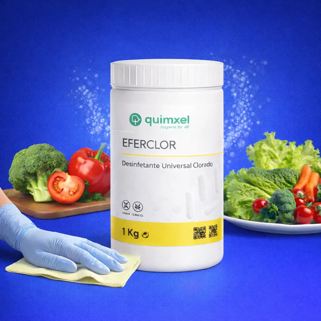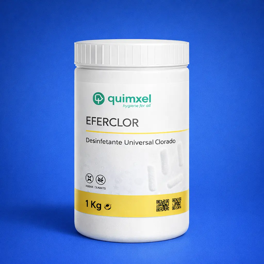 O Eferclor é um desinfetante universal clorado, apresentado sob a forma de pastilhas efervescentes que, em contacto com a água, libertam cloro ativo. Esta formulação garante uma desinfeção eficaz e controlada, com elevado poder germicida contra um vasto espectro de microrganismos.