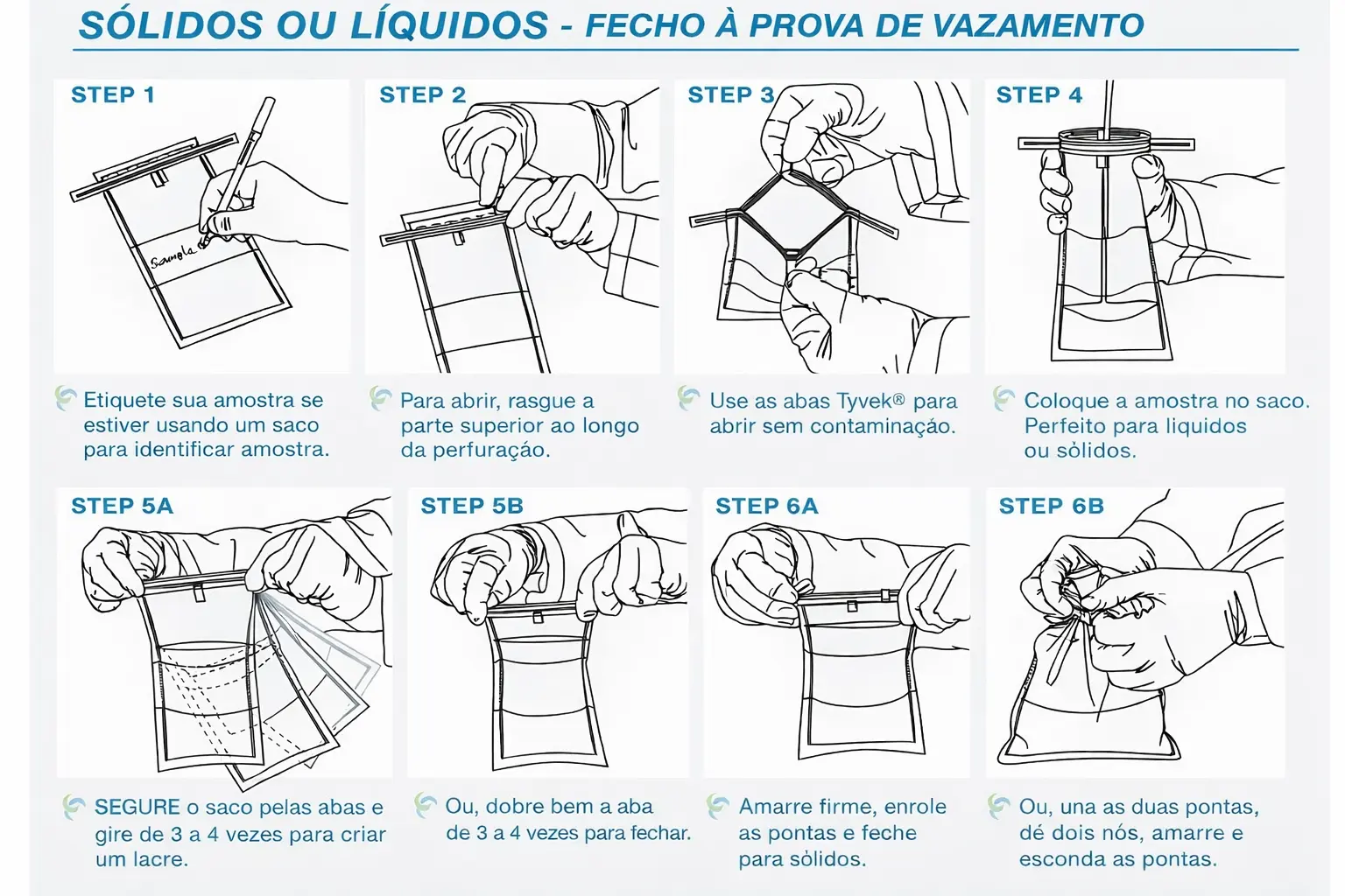 As abas de abertura em Tyvek®, posicionadas perpendicularmente à abertura do saco, mantêm as mãos afastadas do interior, garantindo uma técnica de coleta segura e asséptica, mesmo em ambientes críticos.