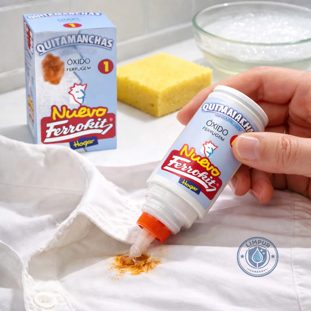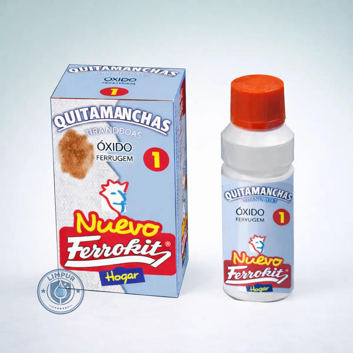 O Tira Nódoas de Óxido Ferrokit é a solução eficaz e imediata para eliminar manchas de ferrugem em tecidos de forma rápida e segura. Desenvolvido para uso doméstico e profissional, atua diretamente sobre a nódoa, removendo-a em poucos instantes sem danificar nem alterar as cores do tecido.